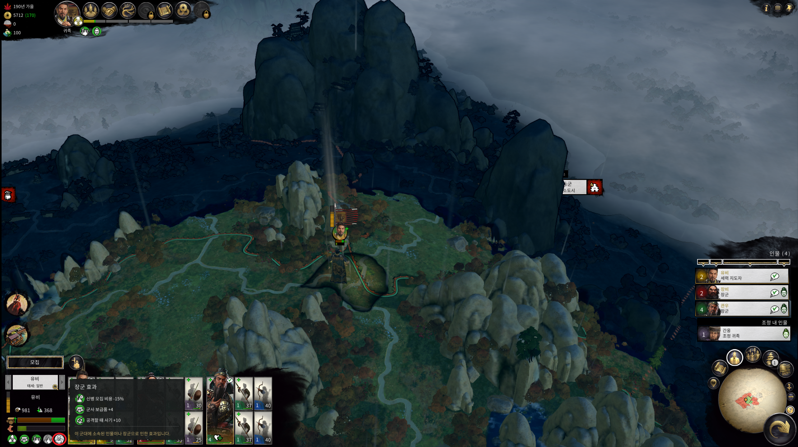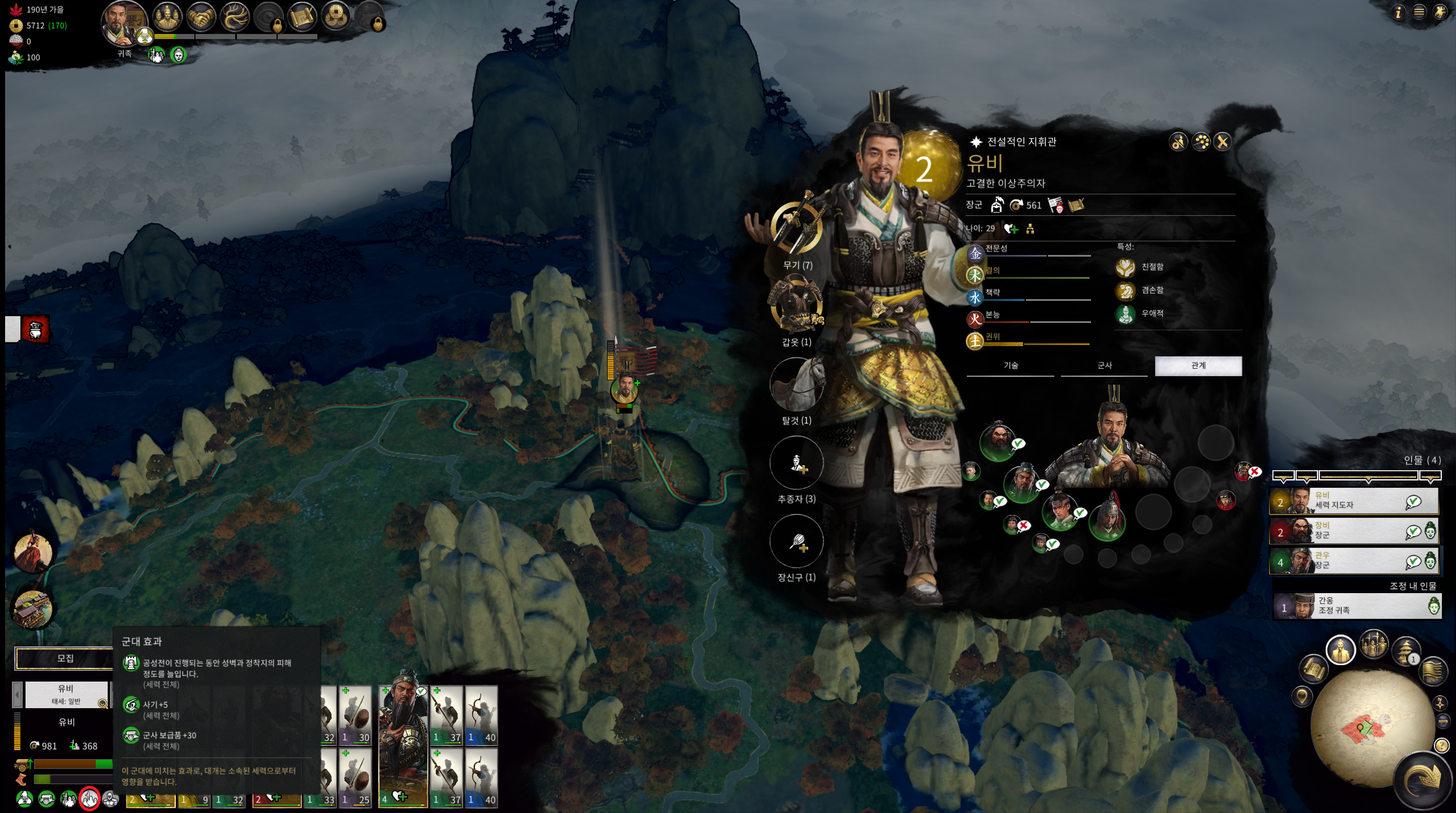 군단에 합류 되어 있는 장수들의 효과 입니다. ( 스샷 유비, 장비, 관우 )