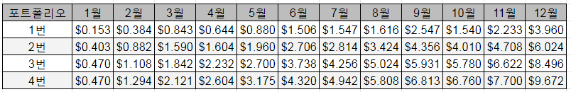 각 종목별로 매월 1주씩 매수한다는 가정하에 계산한 내역입니다.