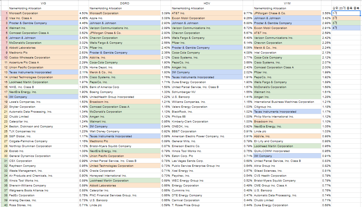 상위 20개 종목 중 4개 ETF 중복 개수를 표시해봤습니다.