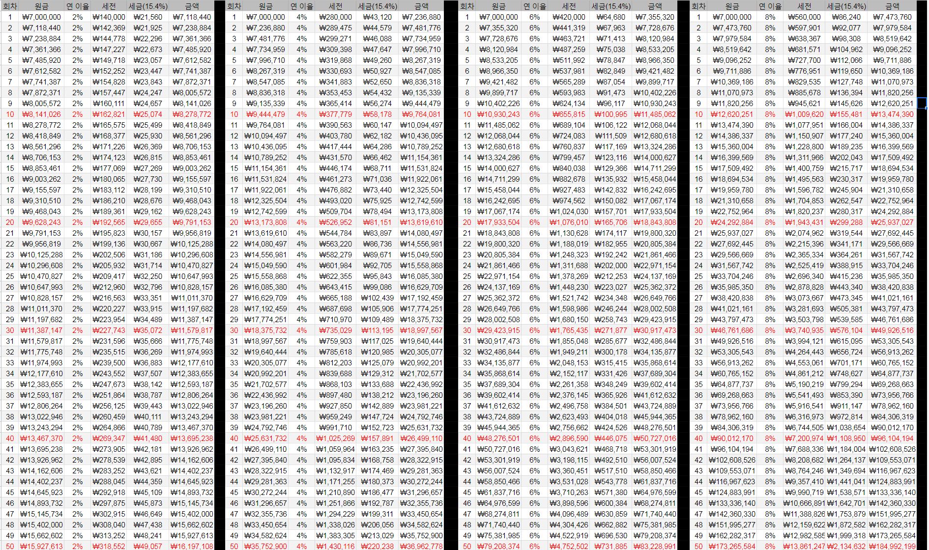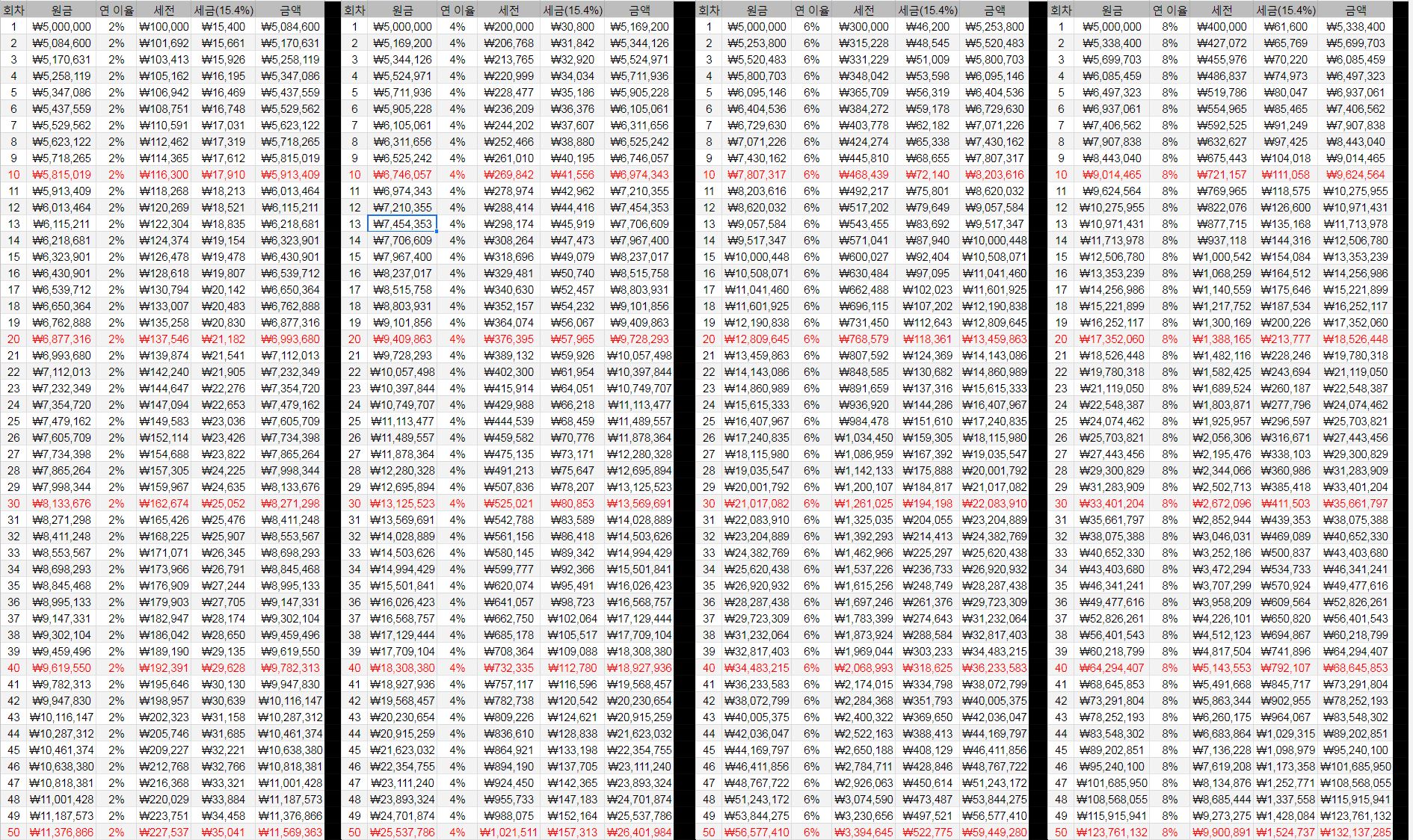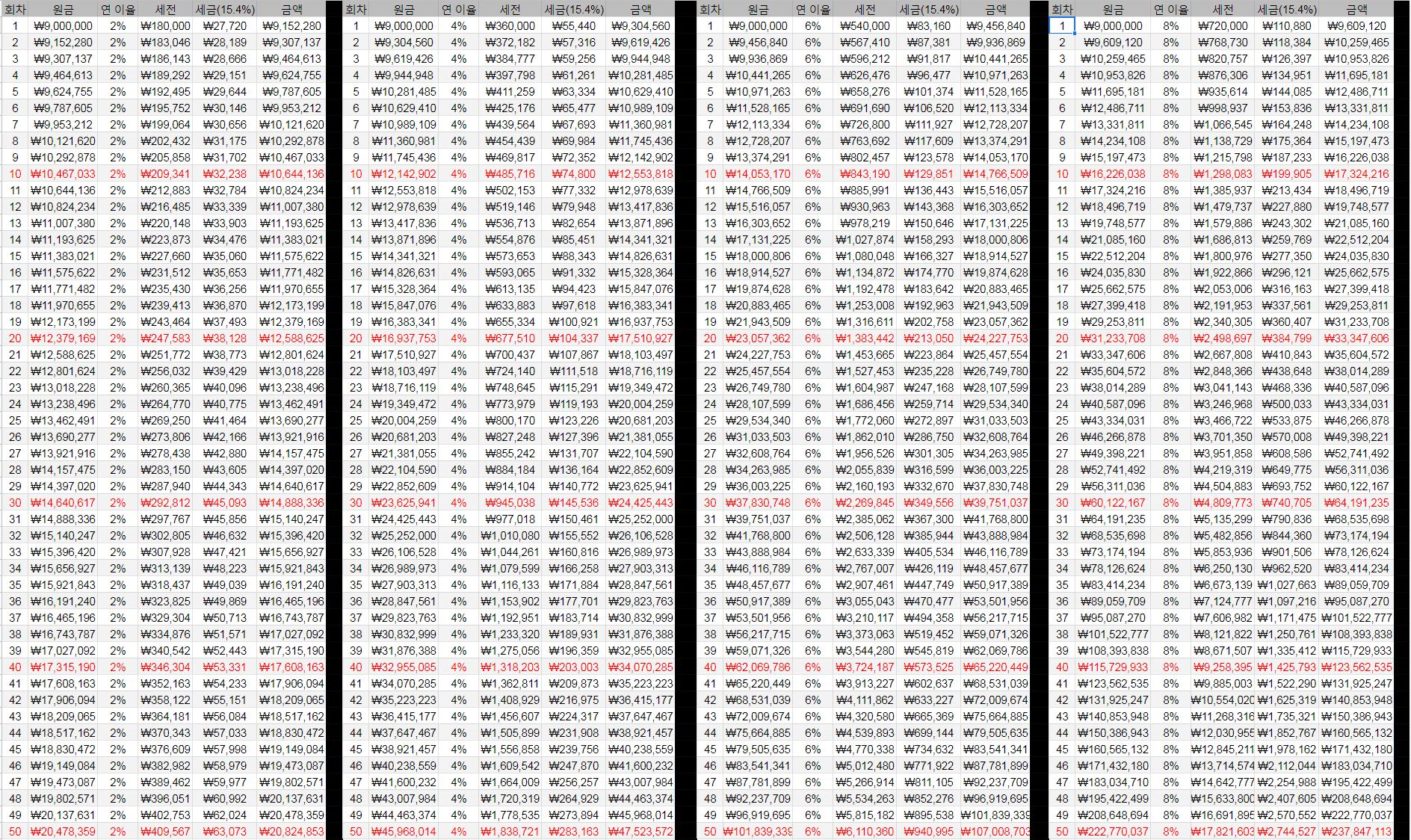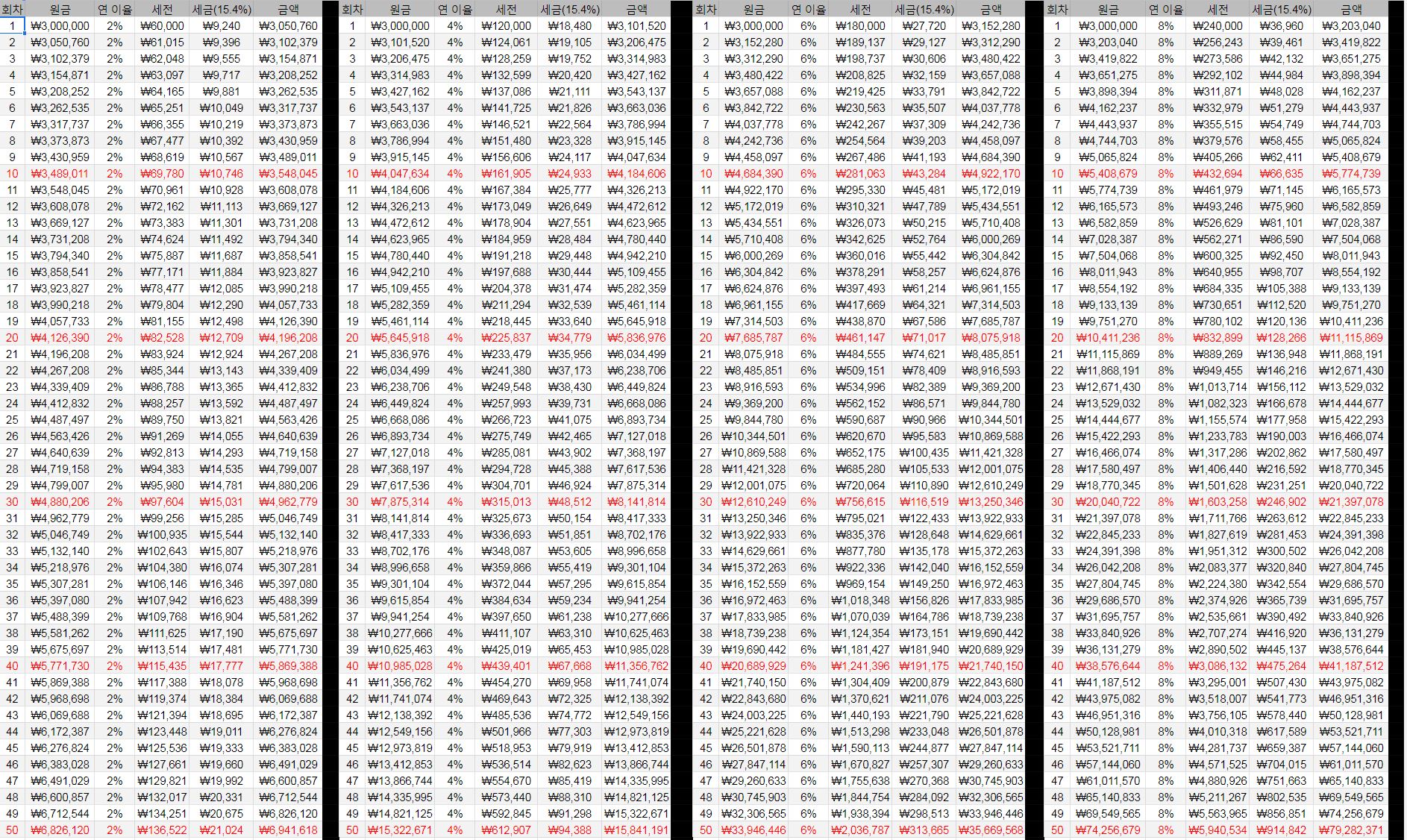| 연 이율 | 세금 전 | 세금 후 | 차이 |