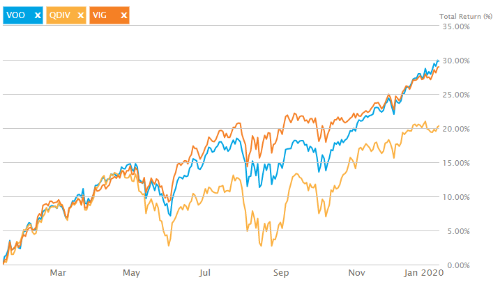 2019.1 ~ 2020.1 비교 ( QDIV가 2018년 상장해서 1년만 비교 )