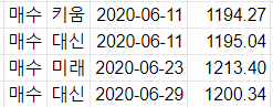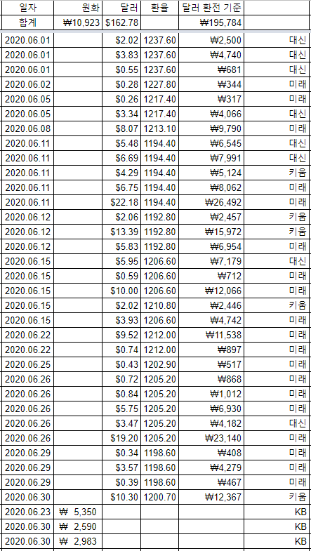 일별로 정리하고 보니 6월 환율이 1237 ~ 1192원까지 약 50원 정도 변동했었네요.