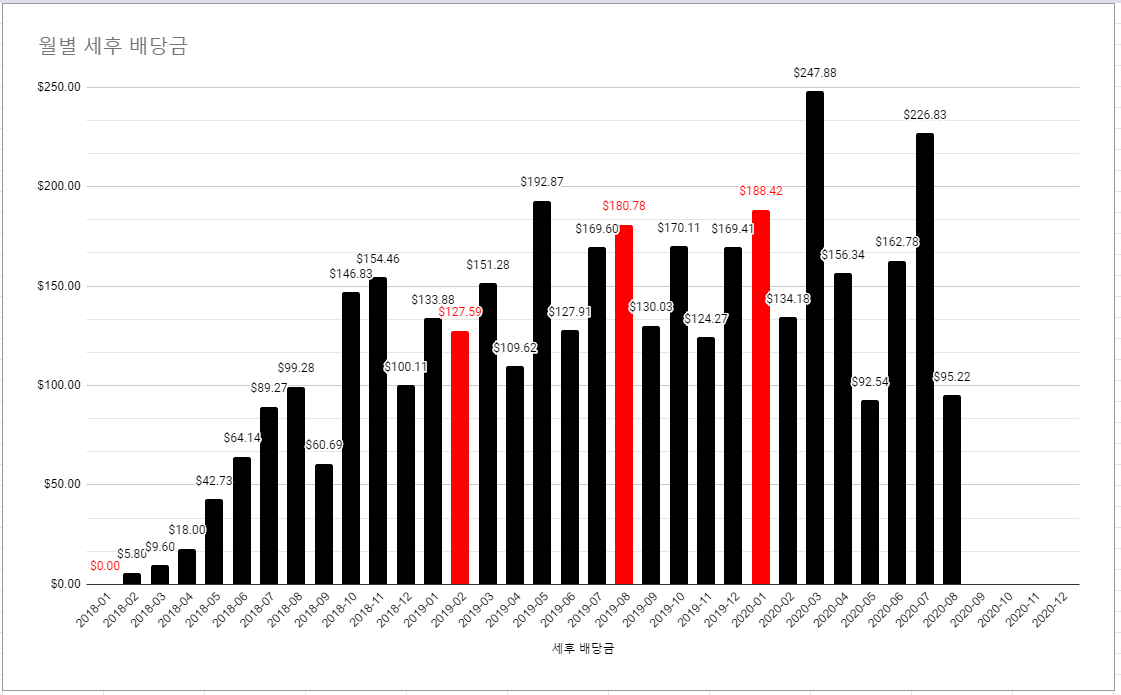 2020년 5월, 8월 배당금이 $100 이하로 내려갔습니다.