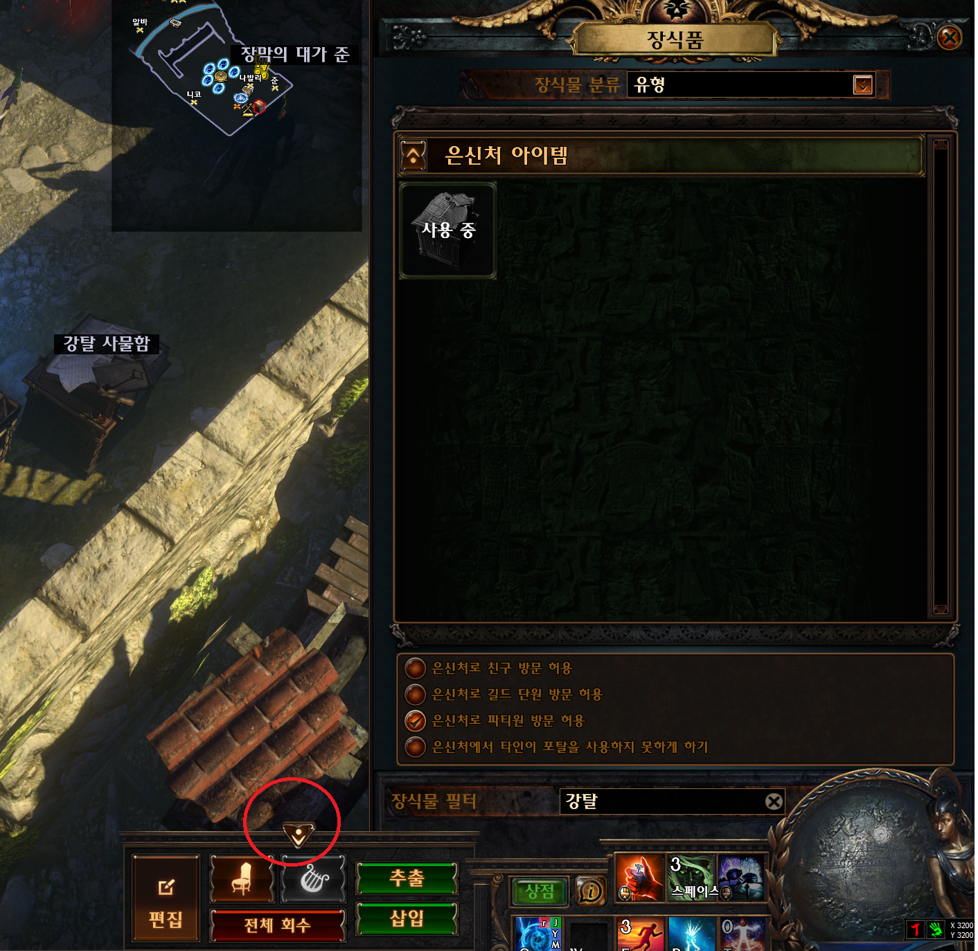 은신처에서 6시 방향 빨강 동그라미 버튼 확인하여 의자 아이콘 클릭