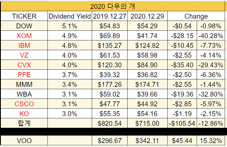 다우의 개 투자 전략을 2020년을 마지막으로 종료하겠습니다.