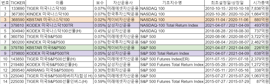 KBSTAR ETF 후발주자로서 0.02%로 보수가 가장 낮으며, 시가총액도 낮습니다.